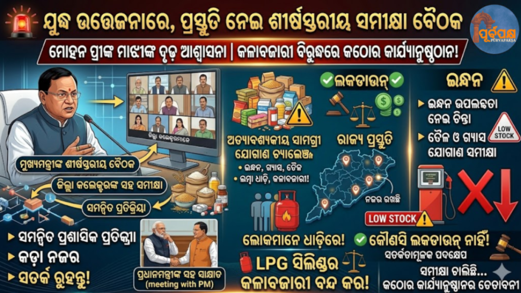 ଓଡ଼ିଶା ମୁଖ୍ୟମନ୍ତ୍ରୀ ମୋହନ ମାଝୀ ସୋମବାର ଦିନ ରାଜ୍ୟବ୍ୟାପୀ ପ୍ରଚଳିତ ‘ଯୁଦ୍ଧ’ ପରିସ୍ଥିତିର ମୂଲ୍ୟାଙ୍କନ ଏବଂ ପ୍ରସ୍ତୁତି ସମୀକ୍ଷା କରିବା ପାଇଁ ଏକ ଉଚ୍ଚସ୍ତରୀୟ ବୈଠକ କରିବାକୁ ଯାଉଛନ୍ତି। ଇନ୍ଧନ ଉପଲବ୍ଧତା ଏବଂ ଆଞ୍ଚଳିକ ବିକାଶ ଉପରେ ବଢ଼ୁଥିବା ଚିନ୍ତା ମଧ୍ୟରେ ଏହି ବୈଠକ ଅନୁଷ୍ଠିତ ହେଉଛି।