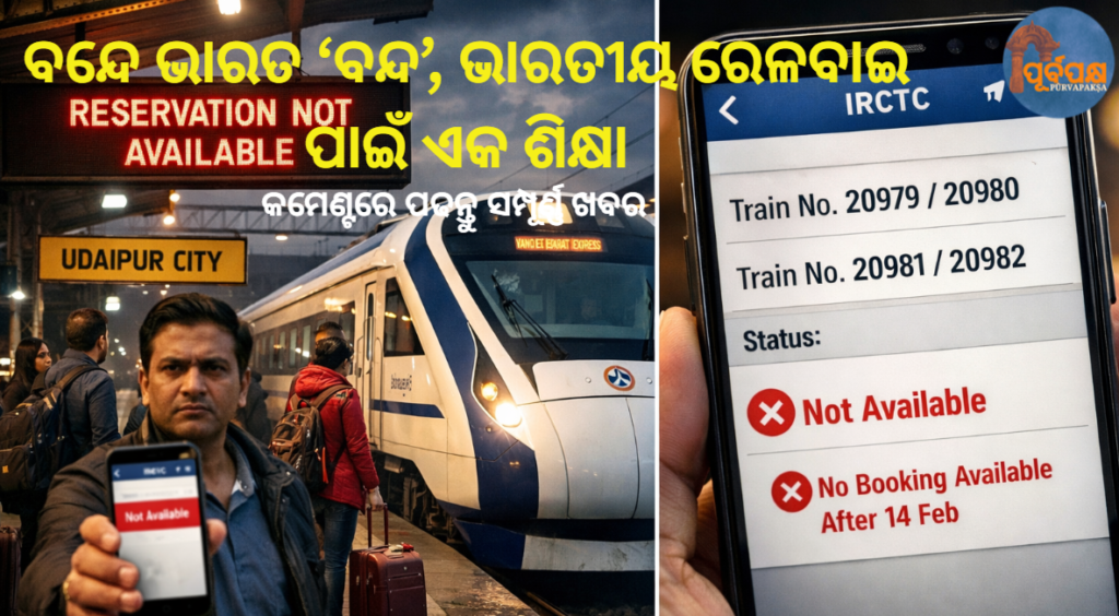 ଖବର ଅନୁଯାୟୀ, ୧୩ ଓ ୧୪ ଫେବୃଆରୀ ପରେ ୨୦୯୭୯/୮୦ (ଉଦୟପୁର ସିଟି ↔ ଜୟପୁର) ଏବଂ ୨୦୯୮୧/୮୨ (ଉଦୟପୁର ସିଟି ↔ ଆଗ୍ରା କ୍ୟାଣ୍ଟ) ଦୁଇଟି ବନ୍ଦେ ଭାରତ ସେବାର ରିଜର୍ଭେସନ୍ ଆର ଉପଲବ୍ଧ ନାହିଁ। IRCTC ପୋର୍ଟାଲରେ ମଧ୍ୟ ତାହାର ପ୍ରତିଫଳନ ଦେଖାଯାଇଛି। ଏହି ପରିସ୍ଥିତି ଅନେକ ପ୍ରଶ୍ନ ଉଠାଇଛି—କି ବନ୍ଦେ ଭାରତ ଫେଲ୍? କି ରୁଟ୍ ଚୟନରେ ତ୍ରୁଟି? କିମ୍ବା ଯାତ୍ରୀ ଚାହିଦାର ଅନୁମାନରେ ଭୁଲ୍?