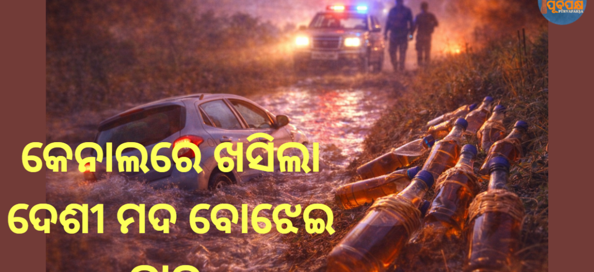 କେନାଲରେ ଖସିଲା ଦେଶୀ ମଦ ବୋଝେଇ କାର || Car carrying country liquor falls into canal