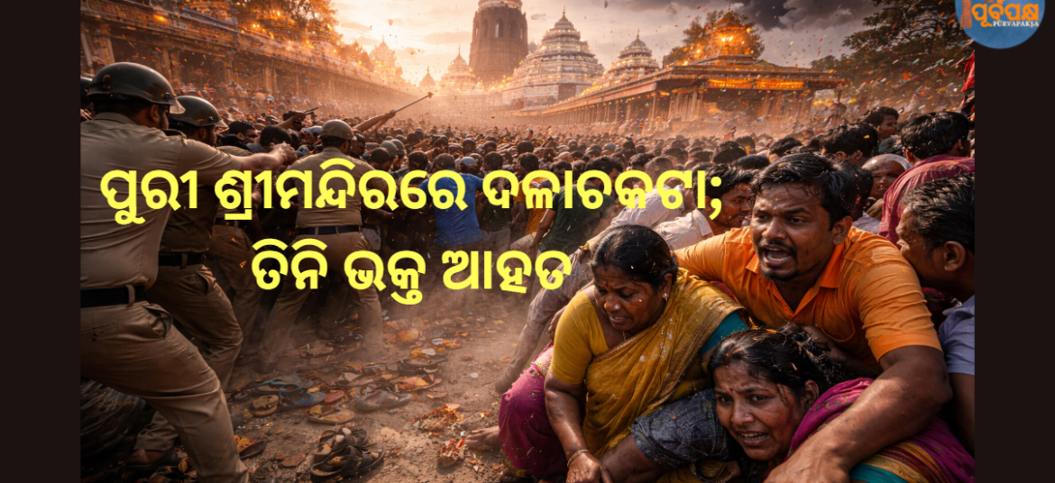 ମଙ୍ଗଳବାର ଦିନ ଦୋଳ ପୂର୍ଣ୍ଣିମା ସମୟରେ ପୁରୀର ଶ୍ରୀ ଜଗନ୍ନାଥ ମନ୍ଦିରରେ ଦୋଳବେଦୀ ଅଞ୍ଚଳ ନିକଟରେ ଭକ୍ତଙ୍କ ଅଭୂତପୂର୍ବ ଭିଡ଼ ପରେ ଦଳାଚକଟା ଭଳି ପରିସ୍ଥିତି ସୃଷ୍ଟି ହୋଇଥିଲା। ଏହି ଘଟଣା ଘଟିଥିଲା ଯେତେବେଳେ ପୂଜା କାର୍ଯ୍ୟ ସମୟରେ ଦେବତାମାନଙ୍କୁ ଦର୍ଶନ କରିବା ପାଇଁ ବହୁ ସଂଖ୍ୟକ ତୀର୍ଥଯାତ୍ରୀ ଏକାଠି ହୋଇଥିଲେ, ଯାହା ଫଳରେ ଭିଡ଼ ମଧ୍ୟରେ ଠେଲାପେଲା ହୋଇଥିଲା। ଦୋଳବେଦୀ ନିକଟରେ ଭିଡ଼ ବିଶୃଙ୍ଖଳା ପ୍ରାଥମିକ ରିପୋର୍ଟ ଅନୁଯାୟୀ, ଯେତେବେଳେ ଦେବତାମାନେ ପଶ୍ଚିମ ଦ୍ୱାର … Continue reading ପୁରୀ ଶ୍ରୀମନ୍ଦିରରେ ଦଳାଚକଟା; ତିନି ଭକ୍ତ ଆହତ || Clashes at Puri temple; three devotees injured
