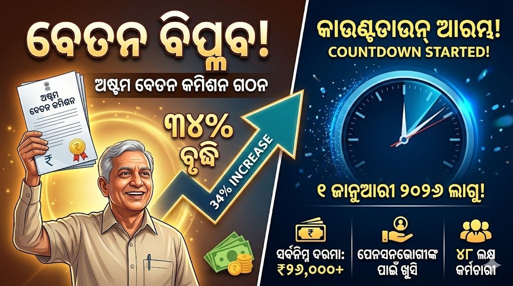 କେନ୍ଦ୍ର ସରକାରୀ କର୍ମଚାରୀ ଏବଂ ପେନସନଭୋଗୀଙ୍କ ପାଇଁ ଆଗାମୀ ଦିନରେ ଏକ ବଡ଼ ଖୁସି ଖବର ଆସିବାକୁ ଯାଉଛି। ସପ୍ତମ ବେତନ କମିଶନର ୧୦ ବର୍ଷ ପୂରଣ ହେବାକୁ ଯାଉଥିବା ବେଳେ ଏବେ ଅଷ୍ଟମ ବେତନ କମିଶନ (8th Pay Commission) ଗଠନ ନେଇ ଚର୍ଚ୍ଚା ଜୋର ଧରିଛି। ବିଭିନ୍ନ ଗଣମାଧ୍ୟମ ଓ ସୂତ୍ରରୁ ମିଳିଥିବା ସୂଚନା ଅନୁଯାୟୀ, ଅଷ୍ଟମ ବେତନ କମିଶନ ଲାଗୁ ହେଲେ କର୍ମଚାରୀଙ୍କ ମୌଳିକ ଦରମାରେ ପ୍ରାୟ ୩୪ ପ୍ରତିଶତ ପର୍ଯ୍ୟନ୍ତ ବୃଦ୍ଧି ଘଟିପାରେ। ଏହା ସହିତ ଫିଟମେଣ୍ଟ ଫ୍ୟାକ୍ଟର ଏବଂ ଭତ୍ତା କ୍ଷେତ୍ରରେ ମଧ୍ୟ ବଡ଼ ଧରଣର ସଂସ୍କାର ହେବାର ସମ୍ଭାବନା ରହିଛି।