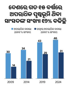 ୨୦୧୯ ମସିହାରେ, ୪୩% ସାଂସଦଙ୍କ ବିରୁଦ୍ଧରେ ଅପରାଧିକ ମାମଲା ରହିଥିଲା ଏବଂ ପ୍ରାୟ ୨୯% ସାଂସଦଙ୍କ ବିରୁଦ୍ଧରେ ଗୁରୁତର ଅଭିଯୋଗ ଥିଲା। ୨୦୨୪ ନିର୍ବାଚନ ପରେ ଗଠିତ ସଂସଦରେ ଏହି ସଂଖ୍ୟା ଆହୁରି ବୃଦ୍ଧି ପାଇଛି। ବର୍ତ୍ତମାନ, ୪୬% ସାଂସଦ ଫୌଜଦାରୀ ମାମଲା ଏବଂ ୩୧% ଗୁରୁତର ମାମଲା ସାମ୍ନା କରୁଛନ୍ତି।