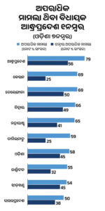 ବିଧାୟକମାନଙ୍କ ଉପରେ ଥିବା ଅପରାଧିକ ମାମଲା ଓ ଗମ୍ଭୀର ଅପରାଧିକ ମାମଲାରେ ଆନ୍ଧ୍ରପ୍ରଦେଶ ଯଥାକ୍ରମେ ୭୯ ଓ ୫୬%, କେରଳରେ ୬୯ ଓ ୨୫%, ତେଲେଙ୍ଗାନା ୬୯ ଓ ୫୦%, ବିହାରରେ ୬୬ ଓ ୪୯%, ମହାରାଷ୍ଟ୍ରରେ ୬୫ ଓ ୪୧%, ତାମିଲନାଡୁରେ ୫୯ ଓ ୨୫%, ଓଡ଼ିଶାରେ ୫୮ ଓ ୪୫%, କର୍ଣ୍ଣାଟକରେ ୫୫ ଓ ୩୨%, ଝାଡ଼ଖଣ୍ଡରେ ୫୪ ଓ ୪୫% ଓ ଉତ୍ତରପ୍ରଦେଶରେ ୫୦ ଓ ୩୮% ରହିଛି।