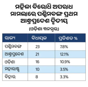 ମହିଳା ବିରୋଧି ଅପରାଧ ମାମଲାରେ ଛନ୍ଦି ହୋଇଥିବା ବିଧାୟକମାନଙ୍କ ତାଲିକାରେ ପଶ୍ଚିମବଙ୍ଗର ୨୩ ବିଧାୟକ ସହିତ ପ୍ରଥମ, ଆନ୍ଧ୍ରପ୍ରଦେଶ ୨୧ ବିଧାୟକ ସହିତ ଦ୍ୱିତୀୟ, ଓଡ଼ିଶା ୧୬ ବିଧାୟକ ସହିତ ୩ନମ୍ବର, ମହାରାଷ୍ଟ୍ର ୧୦ ବିଧାୟକ ସହିତ ଚତୁର୍ଥ ଓ ବିହାର ୮ ବିଧାୟକ ସହିତ ପଞ୍ଚ ସ୍ଥାନରେ ରହିଛି।