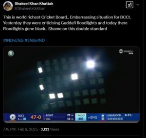 ରାଚିନଙ୍କ ଆଘାତ ପରେ, ସୋସିଆଲ ମିଡିଆରେ ପ୍ରଶଂସକମାନେ ଗଦ୍ଦାଫି ଷ୍ଟାଡିୟମର ଖରାପ ଆଲୋକୀକରଣକୁ ଟାର୍ଗେଟ କରିଥିଲେ। ଏବେ, ପାକିସ୍ତାନୀ ସୋସିଆଲ ମିଡିଆରେ ବ୍ୟବହାରକାରୀମାନେ ଭାରତର ବାରବାଟି ଷ୍ଟାଡିୟମରେ ତ୍ରୁଟିପୂର୍ଣ୍ଣ ଫ୍ଲଡଲାଇଟକୁ ଟାର୍ଗେଟ କରୁଛନ୍ତି। ଜଣେ ବ୍ୟବହାରକାରୀ ଲେଖିଛନ୍ତି, “ଏହା ବିଶ୍ୱର ସବୁଠାରୁ ଧନୀ କ୍ରିକେଟ ବୋର୍ଡ। ଏହା ବିସିସିଆଇ ପାଇଁ ଏକ ଲଜ୍ଜାଜନକ ପରିସ୍ଥିତି। ଗତକାଲି ସେମାନେ ଗଦ୍ଦାଫିଙ୍କ ଫ୍ଲଡଲାଇଟ୍କୁ ସମାଲୋଚନା କରୁଥିଲେ ଏବଂ ଆଜି ସେଠାରେ ଫ୍ଲଡଲାଇଟ୍ଗୁଡ଼ିକ ଲିଭିଯାଇଛି। ଅନେକ ବ୍ୟବହାରକାରୀ ସମାନ ପ୍ରତିକ୍ରିୟା ଦେଇଛନ୍ତି।