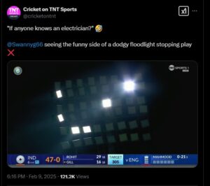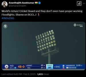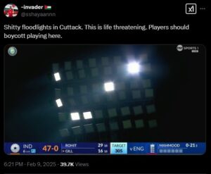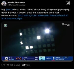 ଭାରତ ଏବଂ ଇଂଲଣ୍ଡ ମଧ୍ୟରେ ଚାଲିଥିବା ତିନିମ୍ୟାଚ୍ ବିଶିଷ୍ଟ ଏକଦିବସୀୟ ସିରିଜର ଦ୍ୱିତୀୟ ମ୍ୟାଚ୍ ଗତ ରବିବାର (୯ ଫେବୃଆରୀ) କଟକର ବାରବାଟି ଷ୍ଟାଡିୟମରେ ଖେଳାଯାଇଥିଲା। ମ୍ୟାଚ୍ର ଦ୍ୱିତୀୟ ଇନିଂସରେ, ଅର୍ଥାତ୍ ଟିମ୍ ଇଣ୍ଡିଆର ବ୍ୟାଟିଂ ସମୟରେ, ଷ୍ଟାଡିୟମର ଫ୍ଲଡ୍ଲାଇଟଗୁଡ଼ିକ ଲିଭିଯାଇଥିଲା। ହଠାତ୍ ଲାଇଟ୍ ବନ୍ଦ ହୋଇଯିବାରୁ ମ୍ୟାଚ୍ କିଛି ସମୟ ପାଇଁ ବନ୍ଦ ରହିଥିଲା। ଏହି ଘଟଣା ପରେ, ସୋସିଆଲ ମିଡିଆରେ କ୍ରିକେଟ୍ ପ୍ରଶଂସକ ବିସିସିଆଇକୁ ଟାହିଟାପରା କରିଛନ୍ତି। କେବଳ ଦେଶ ଭିତରେ ନୁହେଁ ଦେଶ ବାହାରୁ ମଧ୍ୟ ବିସିସିଆଇକୁ କଟାକ୍ଷ ଶୁଣିବାକୁ ମିଳୁଛି।