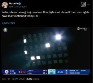 ପଡ଼ୋଶୀ ଦେଶ ପାକିସ୍ତାନର ସୋସିଆଲ ମିଡିଆ ବ୍ୟବହାରକାରୀମାନେ ମଧ୍ୟ ଫ୍ଲଡ୍ ଲାଇଟ୍ ଫେଲ୍ୟୁରକୁ ନେଇ ମଜାଦାର ପ୍ରତିକ୍ରିୟା ଦେଇଛନ୍ତି। ଶନିବାର (୮ ଫେବୃଆରୀ) ଲାହୋରର ଗଦ୍ଦାଫି ଷ୍ଟାଡିୟମରେ ତ୍ରି-ସିରିଜ ଅନ୍ତର୍ଗତ ପାକିସ୍ତାନ ଏବଂ ନ୍ୟୁଜିଲ୍ୟାଣ୍ଡ ମଧ୍ୟରେ ଏକ ମ୍ୟାଚ୍ ଖେଳାଯାଇଥିଲା। ଏହି ମ୍ୟାଚରେ, ନ୍ୟୁଜିଲାଣ୍ଡର ରାଚିନ ରବିନ୍ଦ୍ର ଏକ କ୍ୟାଚ୍ ନେବାକୁ ଚେଷ୍ଟା କରିବା ସମୟରେ ମୁଣ୍ଡରେ ଗଭୀର ଆଘାତ ପାଇଥିଲେ। କାରଣ ସେତେବେଳେ ଷ୍ଟାଡ଼ିୟମରେ ଫ୍ଲଡ୍ ଲାଇଟ୍ ମାଲଫଙ୍କସନ୍ କରିଥିଲା।