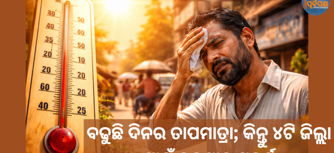 ମଙ୍ଗଳବାରଠାରୁ ସାରା ଓଡ଼ିଶାରେ ଦିନର ତାପମାତ୍ରା ୨ ରୁ ୩ ଡିଗ୍ରୀ ସେଲସିୟସ୍ ବୃଦ୍ଧି ପାଇବାର ସମ୍ଭାବନା ରହିଛି ବୋଲି ଭୁବନେଶ୍ୱରସ୍ଥିତ ଆଞ୍ଚଳିକ ପାଣିପାଗ କେନ୍ଦ୍ର ପୂର୍ବାନୁମାନ କରିଛି, ଯାହା ରାଜ୍ୟର ବିଭିନ୍ନ ସ୍ଥାନରେ ଧୀରେ ଧୀରେ ଗରମ ସ୍ଥିତି ବୃଦ୍ଧି ପାଇବାକୁ ସୂଚିତ କରୁଛି। ପାଣିପାଗ କାର୍ଯ୍ୟାଳୟ ଅନୁଯାୟୀ, ଆଗାମୀ ଦୁଇ ଦିନ ମଧ୍ୟରେ ତାପମାତ୍ରା ବୃଦ୍ଧି ପାଇବାର ସମ୍ଭାବନା ରହିଛି। ତଥାପି, ପରବର୍ତ୍ତୀ ତିନି ଦିନ ମଧ୍ୟରେ ତାପମାତ୍ରାରେ କୌଣସି ଗୁରୁତ୍ୱପୂର୍ଣ୍ଣ ପରିବର୍ତ୍ତନ ହେବ … Continue reading ବଢୁଛି ଦିନର ତାପମାତ୍ରା; କିନ୍ତୁ ୪ଟି ଜିଲ୍ଲା ପାଇଁ ବଜ୍ରପାତ ସତର୍କ || Daytime temperatures are rising; but thunderstorm alert for 4 districts