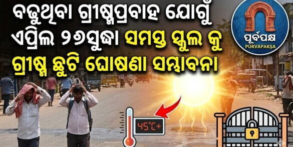 ସ୍କୁଲ ଏବଂ ଗଣଶିକ୍ଷା ମନ୍ତ୍ରୀ ନିତ୍ୟାନନ୍ଦ ଗୋଣ୍ଡ କହିଛନ୍ତି ଯେ ଓଡ଼ିଶା ସରକାର ଏପ୍ରିଲ ୨୭ ସୁଦ୍ଧା ସ୍କୁଲଗୁଡ଼ିକ ପାଇଁ ଗ୍ରୀଷ୍ମ ଛୁଟି ସମ୍ପର୍କରେ ନିଷ୍ପତ୍ତି ଘୋଷଣା କରିବେ। ମନ୍ତ୍ରୀ ସୂଚନା ଦେଇଛନ୍ତି ଯେ ରାଜ୍ୟବ୍ୟାପୀ ସ୍କୁଲଗୁଡ଼ିକ ପାଇଁ ସମାନ ଛୁଟି ସମ୍ପର୍କରେ ଆଲୋଚନା କରିବା ପାଇଁ ରାଜସ୍ୱ ମନ୍ତ୍ରୀଙ୍କ ଅଧ୍ୟକ୍ଷତାରେ ସ୍ୱତନ୍ତ୍ର ରିଲିଫ୍ କମିଶନର (SRC)ଙ୍କ ଅଧ୍ୟକ୍ଷତାରେ ଏକ ବୈଠକ ଅନୁଷ୍ଠିତ ହୋଇଥିଲା। ପ୍ରସ୍ତାବକୁ ଅନୁମୋଦନ ପାଇଁ ମୁଖ୍ୟମନ୍ତ୍ରୀଙ୍କ ନିକଟକୁ ପଠାଯାଇଛି ଏବଂ ଖୁବ୍ ଶୀଘ୍ର … Continue reading ବଢ଼ୁଥିବା ଗ୍ରୀଷ୍ମପ୍ରବାହ ଯୋଗୁଁ ଏପ୍ରିଲ ୨୭ସୁଦ୍ଧା ସମସ୍ତ ସ୍କୁଲ୍ କୁ ଗ୍ରୀଷ୍ମ ଛୁଟି ଘୋଷଣା ସମ୍ଭାବନା || Due to the increasing heat wave, summer vacations are likely to be declared for all schools till April 27.