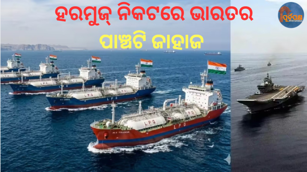 ଭାରତ ଅଭିମୁଖେ ଯାଉଥିବା ପାଞ୍ଚଟି ଜାହାଜ ହରମୁଜ୍ ପ୍ରଣାଳୀ ନିକଟରେ ଛିଡ଼ା ହୋଇଛି, ଯେଉଁଥିରେ ୧.୭ ଲକ୍ଷ ମେଟ୍ରିକ୍ ଟନ୍ ଏଲ୍ପିଜି ରହିଛି। ଇରାନ୍ ଦୁଇ ଦିନ ପୂର୍ବରୁ ଅନୁମତି ଦେଇଥିଲା।