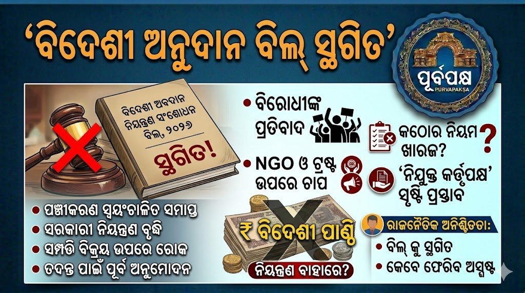 ବିଦେଶୀ ଅବଦାନ ନିୟନ୍ତ୍ରଣ ସଂଶୋଧନ ବିଲ୍, ୨୦୨୬ ବୁଧବାର ଲୋକସଭାରେ ଉପସ୍ଥାପିତ ହୋଇନଥିଲା, ସୂତ୍ର ଅନୁଯାୟୀ ଏହାକୁ ଘେରି ରହିଥିବା ରାଜନୈତିକ ବିବାଦକୁ ଦୃଷ୍ଟିରେ ରଖି ଏହି ପଦକ୍ଷେପକୁ ସ୍ଥଗିତ ରଖାଯାଇଛି।