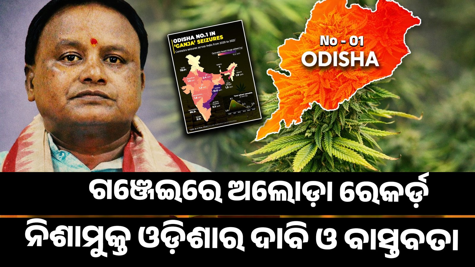 ନାର୍କୋଟିକ କଣ୍ଟ୍ରୋଲ ବ୍ୟୁରୋ (ନଭେମ୍ବର ୨୦୨୫ ପର୍ଯ୍ୟନ୍ତ) ରିପୋର୍ଟ ଅନୁସାରେ, ୨୦୨୦ ରୁ ୨୦୨୫ ମଧ୍ୟରେ ଓଡ଼ିଶାରେ ୧୦ଲକ୍ଷ ୬୦ହଜାର କେଜି ଗଞ୍ଜେଇ ଜବତ ହୋଇଛି। ଏହା ଦେଶରେ ସର୍ବାଧିକ। ଦ୍ୱିତୀୟ ସ୍ଥାନରେ ଆନ୍ଧ୍ରପ୍ରଦେଶ—୫.୫ ଲକ୍ଷ କେଜି। ସିକିମରୁ ମାତ୍ର ୪ କେଜି ଓ କେରଳରୁ ୫,୫୦୦ କେଜି ଜବତ ହୋଇଛି।
