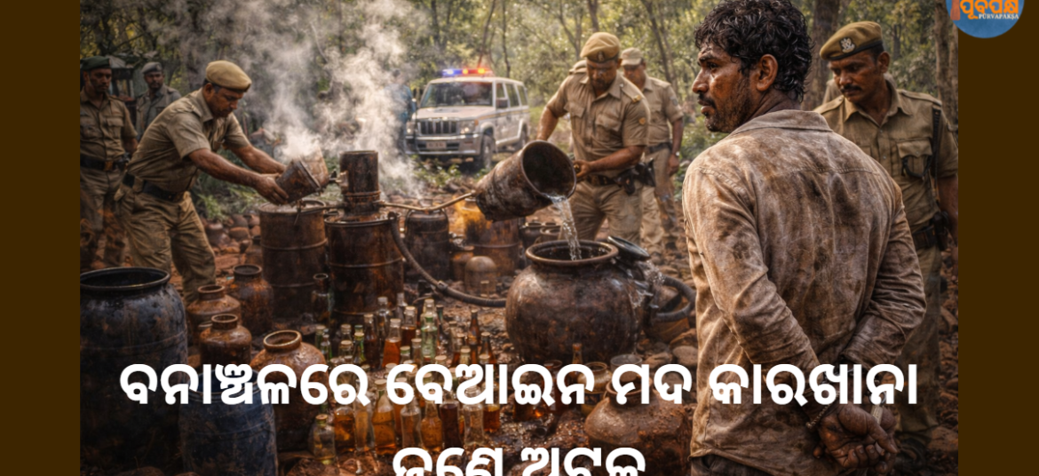 ଏକ ବଡ଼ କାର୍ଯ୍ୟାନୁଷ୍ଠାନ ଗ୍ରହଣ କରି, ପୁରୀ ପୋଲିସ ସଦର ଥାନା ସୀମା ଅନ୍ତର୍ଗତ ସମଙ୍ଗ ଜଳଭଣ୍ଡାର ନିକଟବର୍ତ୍ତୀ ଏକ ଜଙ୍ଗଲ ଅଞ୍ଚଳରେ ଚାଲିଥିବା ଏକ ବେଆଇନ ଦେଶୀ ମଦ ଉତ୍ପାଦନ ୟୁନିଟ୍ ଠାବ କରିଛି। ଏହି ମାମଲାରେ ଜଣେ ବ୍ୟକ୍ତିଙ୍କୁ ଅଟକ ରଖାଯାଇଛି। ବିପୁଳ ପରିମାଣ ଜବତ ନିର୍ଦ୍ଦିଷ୍ଟ ଗୁଇନ୍ଦା ସୂଚନା ଆଧାରରେ, ପୋଲିସ ଦୁର୍ଗମ ଜଙ୍ଗଲ ଅଞ୍ଚଳରେ ଚଢାଉ କରି ୫୦ ଲିଟର ଦେଶୀ ମଦ ସହିତ ୧୩୨୦ ଲିଟର ଫର୍ମେଣ୍ଟ ୱାଶ୍ ଜବତ … Continue reading ବନାଞ୍ଚଳରେ ବେଆଇନ ମଦ କାରଖାନା, ଜଣେ ଅଟକ || Illegal liquor factory in Banachal, one arrested
