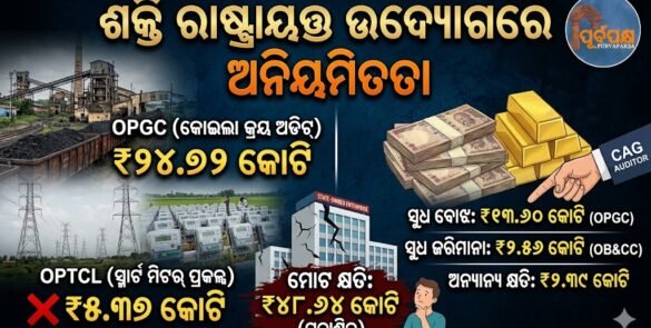 ଭାରତର ମହାଲେଖା ନିୟନ୍ତ୍ରକ ଏବଂ ଅଡିଟର ଜେନେରାଲ ଓଡ଼ିଶାର ପ୍ରମୁଖ ସରକାରୀ ମାଲିକାନା କମ୍ପାନୀଗୁଡ଼ିକରେ ଆର୍ଥିକ ଭୁଲ ପରିଚାଳନା ଏବଂ ପ୍ରକ୍ରିୟାଗତ ଉଲ୍ଲଂଘନର ଅନେକ ଉଦାହରଣ ପ୍ରକାଶ କରିଛନ୍ତି। ମାର୍ଚ୍ଚ ୨୦୨୩ରେ ଶେଷ ହୋଇଥିବା ଅବଧି ପାଇଁ ରାଜ୍ୟ ପବ୍ଲିକ ସେକ୍ଟର ଏଣ୍ଟରପ୍ରାଇଜେସ୍ ର ଅନୁପାଳନ ଏବଂ କାର୍ଯ୍ୟଦକ୍ଷତା ଅଡିଟରେ, CAG ଜାଣିପାରିଲେ ଯେ ଅଦକ୍ଷ କୋଇଲା କ୍ରୟ ପଦ୍ଧତି ଯୋଗୁଁ ଓଡ଼ିଶା ପାୱାର ଜେନେରେସନ୍ କର୍ପୋରେସନ୍ ଲିମିଟେଡ୍ (OPGC) ୨୪.୭୨ କୋଟିର ଏଡାଯାଇପାରିବା ଖର୍ଚ୍ଚ କରିଛି। … Continue reading ଶକ୍ତି ରାଷ୍ଟ୍ରାୟତ୍ତ ଉଦ୍ୟୋଗରେ ଅନିୟମିତତା || Irregularities in energy public sector enterprises