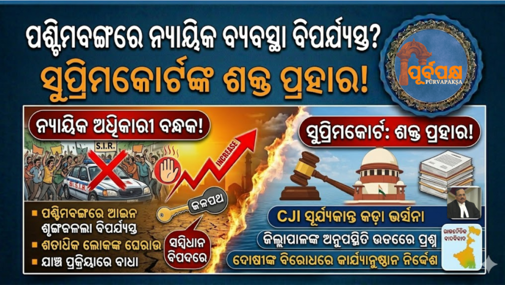 ପଶ୍ଚିମବଙ୍ଗରେ ଆଇନ ଶୃଙ୍ଖଳାର ଶୋଚନୀୟ ସ୍ଥିତି ପୁଣି ଥରେ ସମଗ୍ର ଦେଶରେ ଚର୍ଚ୍ଚାର ବିଷୟ ପାଲଟିଛି। ଏଥର ଶିକାର ହୋଇଛନ୍ତି ନ୍ୟାୟିକ ଅଧିକାରୀ। ସର୍ବୋଚ୍ଚ ଅଦାଲତଙ୍କ ନିର୍ଦ୍ଦେଶକ୍ରମେ ସ୍ୱତନ୍ତ୍ର ତଦନ୍ତ ରିପୋର୍ଟ (ଏସଆଇଆର) ପାଇଁ ଯାଇଥିବା ଅଧିକାରୀଙ୍କୁ ବନ୍ଧକ ରଖାଯିବା ଘଟଣାକୁ ସୁପ୍ରିମକୋର୍ଟ ଅତି ଗମ୍ଭୀରତାର ସହ ନେଇଛନ୍ତି। ମୁଖ୍ୟ ବିଚାରପତି (CJI) ସୂର୍ଯ୍ୟକାନ୍ତ ଏହି ଘଟଣାରେ ପଶ୍ଚିମବଙ୍ଗ ପ୍ରଶାସନକୁ କଡ଼ା ଭର୍ତ୍ସନା କରିବା ସହ ନ୍ୟାୟିକ ସ୍ୱାଧୀନତା ପ୍ରତି ଏହା ଏକ ବଡ଼ ବିପଦ ବୋଲି କହିଛନ୍ତି।