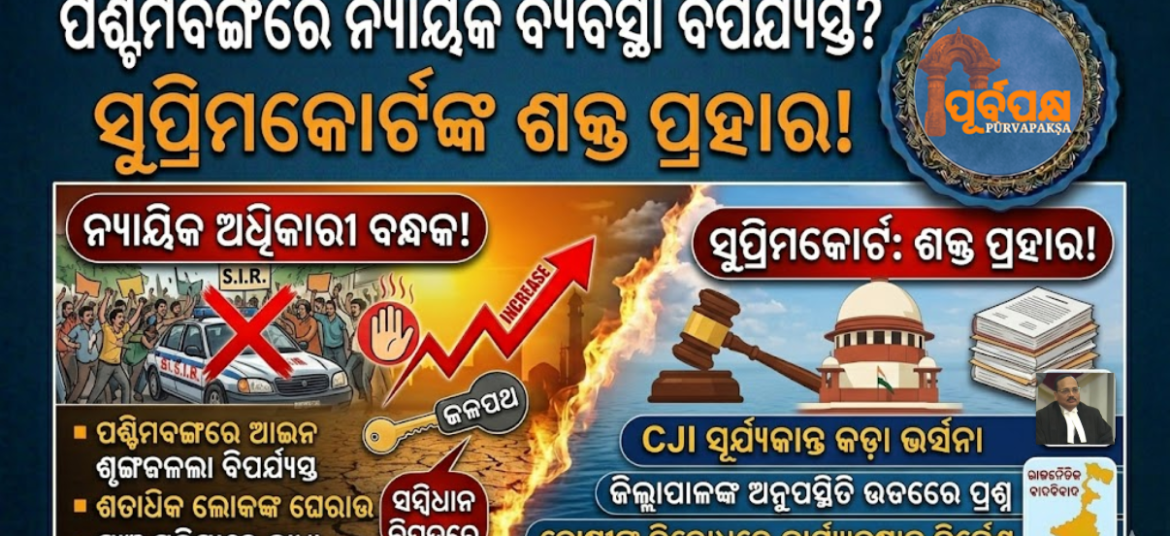 ପଶ୍ଚିମବଙ୍ଗରେ ଆଇନ ଶୃଙ୍ଖଳାର ଶୋଚନୀୟ ସ୍ଥିତି ପୁଣି ଥରେ ସମଗ୍ର ଦେଶରେ ଚର୍ଚ୍ଚାର ବିଷୟ ପାଲଟିଛି। ଏଥର ଶିକାର ହୋଇଛନ୍ତି ନ୍ୟାୟିକ ଅଧିକାରୀ। ସର୍ବୋଚ୍ଚ ଅଦାଲତଙ୍କ ନିର୍ଦ୍ଦେଶକ୍ରମେ ସ୍ୱତନ୍ତ୍ର ତଦନ୍ତ ରିପୋର୍ଟ (ଏସଆଇଆର) ପାଇଁ ଯାଇଥିବା ଅଧିକାରୀଙ୍କୁ ବନ୍ଧକ ରଖାଯିବା ଘଟଣାକୁ ସୁପ୍ରିମକୋର୍ଟ ଅତି ଗମ୍ଭୀରତାର ସହ ନେଇଛନ୍ତି। ମୁଖ୍ୟ ବିଚାରପତି (CJI) ସୂର୍ଯ୍ୟକାନ୍ତ ଏହି ଘଟଣାରେ ପଶ୍ଚିମବଙ୍ଗ ପ୍ରଶାସନକୁ କଡ଼ା ଭର୍ତ୍ସନା କରିବା ସହ ନ୍ୟାୟିକ ସ୍ୱାଧୀନତା ପ୍ରତି ଏହା ଏକ ବଡ଼ ବିପଦ ବୋଲି … Continue reading ପଶ୍ଚିମବଙ୍ଗରେ ନ୍ୟାୟିକ ବ୍ୟବସ୍ଥା ବିପର୍ଯ୍ୟସ୍ତ? ସୁପ୍ରିମକୋର୍ଟଙ୍କ ଶକ୍ତ ପ୍ରହାର! || Is the judicial system in West Bengal a disaster? Supreme Court’s strong blow!