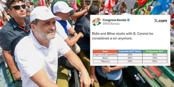 ରାହୁଲ ଗାନ୍ଧୀ-ତେଜସ୍ୱୀ ଯାଦବଙ୍କ ରାଲିରେ ପ୍ରଧାନମନ୍ତ୍ରୀ ନରେନ୍ଦ୍ର ମୋଦୀଙ୍କ ମା’ଙ୍କୁ ଦୁର୍ବ୍ୟବହାର କରିବା ବିବାଦ ପୂର୍ବରୁ କଂଗ୍ରେସର ଗଳାରେ କଣ୍ଟା ହୋଇ ଲାଖିଥିଲା ଏବଂ ଏବେ ବିଡ଼ି ବିବାଦ ତାଙ୍କ ବେକରେ ଫନ୍ଦା ହୋଇ ପଡ଼ିଛି। କେରଳ କଂଗ୍ରେସର ଟ୍ୱିଟ୍ ସହିତ ଆରମ୍ଭ ହୋଇଥିବା ଏହି ମାମଲା ଏକ ବଡ଼ ପ୍ରସଙ୍ଗ ପାଲଟିଛି। ଉପମୁଖ୍ୟମନ୍ତ୍ରୀ ସମ୍ରାଟ ଚୌଧୁରୀଙ୍କ ସମେତ ସମସ୍ତ ବିଜେପି ନେତା ଏହାକୁ ବିହାରର ଅପମାନ ବୋଲି କହି ଟାର୍ଗେଟ କରୁଛନ୍ତି, ଜେଡିୟୁର ରାଷ୍ଟ୍ରୀୟ କାର୍ଯ୍ୟକାରୀ … Continue reading Kerala Congress ‘Bidi-Bihar’ tweet sparks outrage ।। ପ୍ରଥମେ ଗାଳି, ଏବେ ବିଡ଼ି… ବିହାର ନିର୍ବାଚନ ପୂର୍ବରୁ କଂଗ୍ରେସ ଆଉ ଏକ ଅଭଦ୍ରାମି