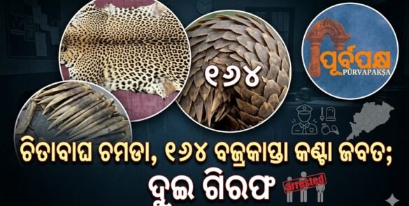 ବୁଧବାର ଦିନ ନୟାଗଡ଼ ଜିଲ୍ଲାର ବନ ଅଧିକାରୀମାନେ ବେଆଇନ ବନ୍ୟପ୍ରାଣୀ ଚାଲାଣରେ ଭୂମିକା ଥିବା ଅଭିଯୋଗରେ ଜଣେ ମହିଳା ଏବଂ ତାଙ୍କ ପୁଅକୁ ଗିରଫ କରିଛନ୍ତି। ସେମାନଙ୍କ ନିକଟରୁ ଚିତାବାଘ ଚମଡ଼ା ଏବଂ ବହୁ ପରିମାଣର ପାଙ୍ଗୋଲିନ୍ କାଲେ ଜବତ ହୋଇଛି, ଯାହା ଏହି ଅଞ୍ଚଳରେ ସକ୍ରିୟ ଶିକାର ନେଟୱାର୍କ ଉପରେ ନୂତନ ଚିନ୍ତା ସୃଷ୍ଟି କରିଛି। ଗୁଇନ୍ଦା ସୂଚନା ଆଧାରରେ, ବନ ବିଭାଗ ଅଧିକାରୀମାନେ ଦଶପଲ୍ଲା ରେଞ୍ଜ ଅନ୍ତର୍ଗତ କୁଜାମେଣ୍ଡି ବିଟ୍ ହାଉସ୍ ଅଞ୍ଚଳରେ ଚଢାଉ … Continue reading ଚିତାବାଘ ଚମଡା, ୧୬୪ ବଜ୍ରକାପ୍ତା କଣ୍ଟା ଜବତ; ଦୁଇ ଗିରଫ || Leopard skin, 164 lightning rods seized; two arrested