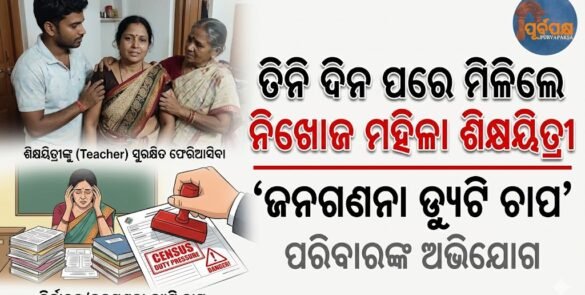 ବାରିପଦାର ଜଣେ ସ୍କୁଲ ଶିକ୍ଷୟିତ୍ରୀ ଜ୍ୟୋତ୍ସ୍ନା ସାହୁ, ଯିଏକି ଅନେକ ଦିନ ଧରି ନିଖୋଜ ଥିଲେ, ଶେଷରେ ମଙ୍ଗଳବାର ଦିନ ତାଙ୍କୁ ଖୋଜାଖୋଜି କରାଯାଇ ଉଦ୍ଧାର କରାଯାଇଥିଲା, ଯାହା ତାଙ୍କ ପରିବାର ଏବଂ କର୍ତ୍ତୃପକ୍ଷଙ୍କୁ ଆଶ୍ୱସ୍ତି ଦେଇଥିଲା। ରିପୋର୍ଟ ଅନୁଯାୟୀ, ଜ୍ୟୋତ୍ସ୍ନା ୧୮ ତାରିଖରେ ଜନଗଣନା କାର୍ଯ୍ୟରେ ବାହାରକୁ ଯାଇଥିଲେ କିନ୍ତୁ ଫେରି ନଥିଲେ, ଯାହା ତାଙ୍କ ସ୍ଥାନ ବିଷୟରେ ଚିନ୍ତା ସୃଷ୍ଟି କରିଥିଲା। କୌଣସି ଯୋଗାଯୋଗ ବିନା ଦିନ ବିତିବା ସହିତ, ତାଙ୍କ ପରିବାର ସଦସ୍ୟ … Continue reading ତିନି ଦିନ ପରେ ମିଳିଲେ ନିଖୋଜ ମହିଳା ଶିକ୍ଷୟିତ୍ରୀ, ‘ଜନଗଣନା ଡ୍ୟୁଟି ଚାପ’ ଅଭିଯୋଗ || Missing female teacher found after three days, ‘census duty pressure’ alleged