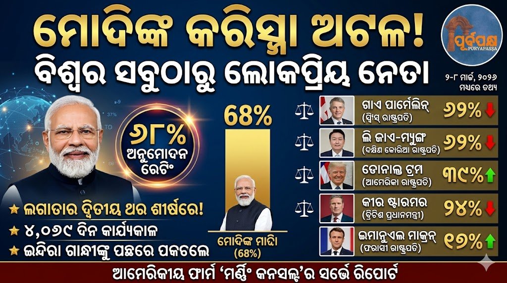 ଆମେରିକୀୟ ଡାଟା ଆନାଲିଟିକ୍ସ ଫାର୍ମ ‘ମର୍ଣ୍ଣିଂ କନସଲ୍ଟ’ ଦ୍ୱାରା କରାଯାଇଥିବା ସଦ୍ୟତମ ବିଶ୍ୱସ୍ତରୀୟ ସର୍ଭେରେ, ପ୍ରଧାନମନ୍ତ୍ରୀ ନରେନ୍ଦ୍ର ମୋଦି ପୁଣି ଥରେ ବିଶ୍ୱର ସବୁଠାରୁ ଲୋକପ୍ରିୟ ଗଣତାନ୍ତ୍ରିକ ନେତା ଭାବରେ ଉଭା ହୋଇଛନ୍ତି। ସେ ୬୮% ର ଦୃଢ଼ ଅନୁମୋଦନ ରେଟିଂ ସହିତ ଶୀର୍ଷ ସ୍ଥାନ ହାସଲ କରିଛନ୍ତି।