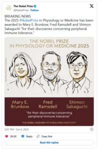 ୨୦୨୫ ମସିହାରେ ଶରୀର ବିଜ୍ଞାନ କିମ୍ବା ଚିକିତ୍ସାରେ ନୋବେଲ ପୁରସ୍କାର ମେରୀ ଇ. ବ୍ରୁଙ୍କୋ, ଫ୍ରେଡ୍ ରାମସଡେଲ୍ ଏବଂ ଶିମୋନ୍ ସାକାଗୁଚିଙ୍କୁ ପର୍ଫେରାଲ୍ ଇମ୍ମ୍ୟୁନ୍ ସହନଶୀଳତା ସମ୍ବନ୍ଧୀୟ ସେମାନଙ୍କର ଐତିହାସିକ ଆବିଷ୍କାର ପାଇଁ ଜଣାଯାଇଥିଲା ଯାହା ପ୍ରତିରକ୍ଷା ପ୍ରଣାଳୀକୁ ଶରୀରକୁ କ୍ଷତି ପହଞ୍ଚାଇବାରୁ ରୋକିଥାଏ।