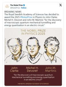 ୨୦୨୫ ମସିହାରେ ପଦାର୍ଥ ବିଜ୍ଞାନରେ ନୋବେଲ ପୁରସ୍କାର “ଏକ ବୈଦ୍ୟୁତିକ ସର୍କିଟରେ ମାକ୍ରୋସ୍କୋପିକ୍ କ୍ୱାଣ୍ଟମ୍ ମେକାନିକାଲ୍ ଟନେଲିଂ ଏବଂ ଶକ୍ତି ପରିମାଣୀକରଣ ଆବିଷ୍କାର ପାଇଁ” ଜନ୍ କ୍ଲାର୍କ, ମିଶେଲ୍ ଏଚ୍. ଡେଭୋରେଟ୍ ଏବଂ ଜନ୍ ଏମ୍. ମାର୍ଟିନିସ୍ ଙ୍କୁ ମିଳିତ ଭାବରେ ପ୍ରଦାନ କରାଯାଇଥିଲା।