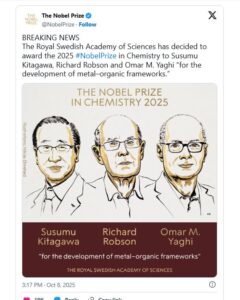 ରୟାଲ ସ୍ୱିଡିସ୍ ଏକାଡେମୀ ଅଫ୍ ସାଇନ୍ସେସ୍ “ଧାତୁ-ଜୈବ ଢାଞ୍ଚାର ବିକାଶ ପାଇଁ” ସୁସୁମୁ କିଟାଗାୱା, ରିଚାର୍ଡ ରବସନ୍ ଏବଂ ଓମାର ଏମ୍. ୟାଘିଙ୍କୁ ରସାୟନ ବିଜ୍ଞାନରେ ୨୦୨୫ ନୋବେଲ ପୁରସ୍କାର ପ୍ରଦାନ କରିବାକୁ ନିଷ୍ପତ୍ତି ନେଇଛି।