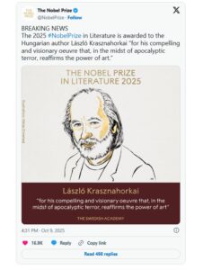 ୨୦୨୫ ମସିହାରେ ସାହିତ୍ୟ ପାଇଁ ନୋବେଲ ପୁରସ୍କାର ହଙ୍ଗେରୀୟ ଲେଖକ “ଲାସଜଲୋ କ୍ରାସ୍ନାହୋରକାଇ” “ତାଙ୍କର ଆକର୍ଷଣୀୟ ଏବଂ ଦୂରଦୃଷ୍ଟିପୂର୍ଣ୍ଣ କୃତି ପାଇଁ ଯାହା, ସର୍ବନାଶକ ଆତଙ୍କ ମଧ୍ୟରେ, କଳାର ଶକ୍ତିକୁ ପୁନଃନିର୍ମାଣ କରେ।”