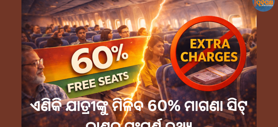 ବିମାନ ଯାତ୍ରୀମାନଙ୍କ ପାଇଁ ଏକ ବଡ଼ ଆଶ୍ୱସ୍ତି ସ୍ୱରୂପ, ବେସାମରିକ ବିମାନ ଚଳାଚଳ ମନ୍ତ୍ରଣାଳୟ ବିମାନ କମ୍ପାନୀଗୁଡ଼ିକୁ ନିର୍ଦ୍ଦେଶ ଦେଇଛି ଯେ ପ୍ରତ୍ୟେକ ବିମାନରେ ଅତି କମରେ ୬୦ ପ୍ରତିଶତ ସିଟ୍ କୌଣସି ଅତିରିକ୍ତ ଦେୟ ବିନା ଯୋଗାଇ ଦିଆଯାଉ। ଏହି ପଦକ୍ଷେପର ଲକ୍ଷ୍ୟ ଯାତ୍ରୀଙ୍କ ସୁବିଧାକୁ ଉନ୍ନତ କରିବା ଏବଂ ବିମାନ ବୁକିଂ ସମୟରେ ନିରପେକ୍ଷ ପ୍ରବେଶ ସୁନିଶ୍ଚିତ କରିବା। ଏକ ସରକାରୀ ପ୍ରେସ୍ ବିଜ୍ଞପ୍ତି ଅନୁଯାୟୀ, ଦେଶରେ କାର୍ଯ୍ୟ କରୁଥିବା ବିମାନ କମ୍ପାନୀଗୁଡ଼ିକରେ ସ୍ୱଚ୍ଛତା, … Continue reading ଏଣିକି ଯାତ୍ରୀଙ୍କୁ ମିଳିବ 60% ସିଟ୍ ମାଗଣା; ଜାଣନ୍ତୁ ସଂପୂର୍ଣ୍ଣ ତଥ୍ୟ || Now passengers will get 60% seats free; know all the details