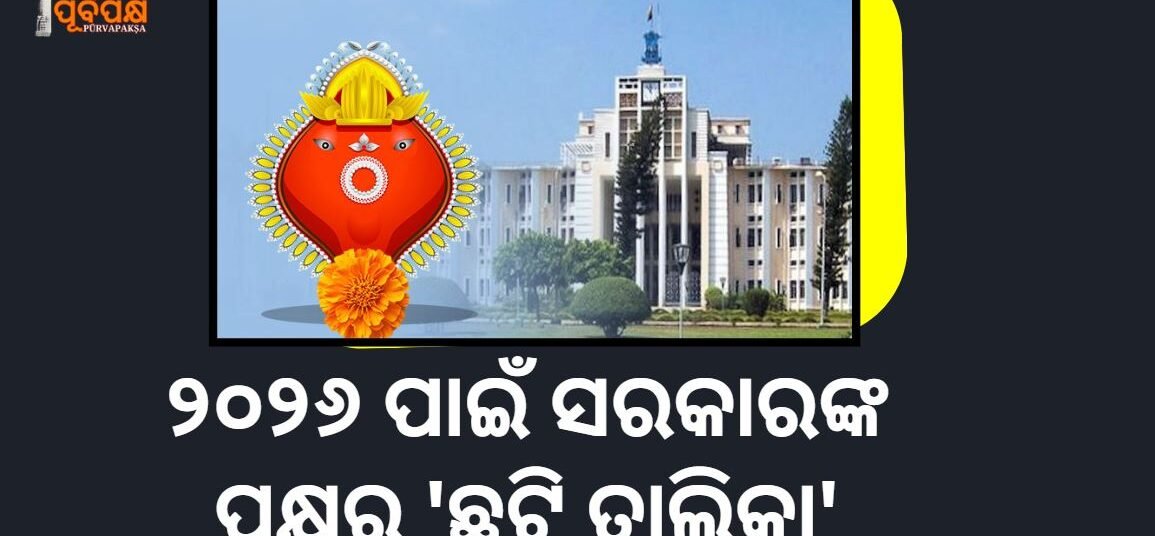 ଓଡ଼ିଶା ସରକାର ୨୦୨୬ ବର୍ଷ ପାଇଁ ସରକାରୀ ଛୁଟି ତାଲିକା ପ୍ରକାଶ କରିଛନ୍ତି, ଯେଉଁଥିରେ ଜାତୀୟ ଛୁଟି, ରାଜ୍ୟ-ନିର୍ଦ୍ଦିଷ୍ଟ ପର୍ବ ଏବଂ ଆଞ୍ଚଳିକ ପାଳନର ରୂପରେଖା ଦିଆଯାଇଛି। ତାଲିକାରେ ମକର ସଂକ୍ରାନ୍ତି, ଉତ୍କଳ ଦିବସ, ରଜ ସଂକ୍ରାନ୍ତି, ରଥଯାତ୍ରା, ଗଣେଶ ପୂଜା, ନୂଆଖାଇ ଏବଂ ଦୀପାବଳି ଭଳି ପ୍ରମୁଖ ସାଂସ୍କୃତିକ ଉତ୍ସବ ସହିତ ଗଣତନ୍ତ୍ର ଦିବସ, ସ୍ୱାଧୀନତା ଦିବସ ଏବଂ ଗାନ୍ଧୀ ଜୟନ୍ତୀ ଭଳି ଜାତୀୟ ପର୍ବଗୁଡ଼ିକ ଅନ୍ତର୍ଭୁକ୍ତ। ବିଜ୍ଞପ୍ତିରେ ସରକାରୀ କାର୍ଯ୍ୟାଳୟ ଏବଂ ପ୍ରତିଷ୍ଠାନ ପାଇଁ … Continue reading Odisha Government releases ‘Holiday List’ for 2026; Check details ।। ୨୦୨୬ ପାଇଁ ଓଡ଼ିଶା ସରକାରଙ୍କ ପକ୍ଷରୁ ‘ଛୁଟି ତାଲିକା’ ପ୍ରକାଶ; ବିବରଣୀ ଯାଞ୍ଚ କରନ୍ତୁ