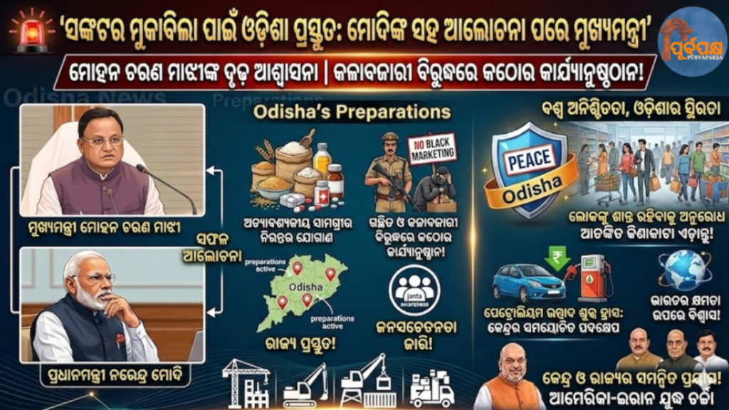 ପଶ୍ଚିମ ଏସିଆ ସଙ୍କଟ ଉପରେ ପ୍ରଧାନମନ୍ତ୍ରୀ ନରେନ୍ଦ୍ର ମୋଦିଙ୍କ ସହ ଏକ ଭର୍ଚୁଆଲ୍ ବୈଠକ ପରେ, ଶୁକ୍ରବାର ଦିନ ଓଡ଼ିଶା ମୁଖ୍ୟମନ୍ତ୍ରୀ ମୋହନ ଚରଣ ମାଝୀ ଦୃଢ଼ ଭାବରେ କହିଛନ୍ତି ଯେ ରାଜ୍ୟ ସରକାର ଉଦୀୟମାନ ଚ୍ୟାଲେଞ୍ଜର ମୁକାବିଲା କରିବା ପାଇଁ ସମ୍ପୂର୍ଣ୍ଣ ପ୍ରସ୍ତୁତ, ଅତ୍ୟାବଶ୍ୟକୀୟ ସାମଗ୍ରୀର ନିରନ୍ତର ଯୋଗାଣ ଏବଂ ଗଚ୍ଛିତ ଏବଂ କଳାବଜାରୀ ବିରୁଦ୍ଧରେ କଠୋର କାର୍ଯ୍ୟାନୁଷ୍ଠାନ ନିଶ୍ଚିତ କରିବା।