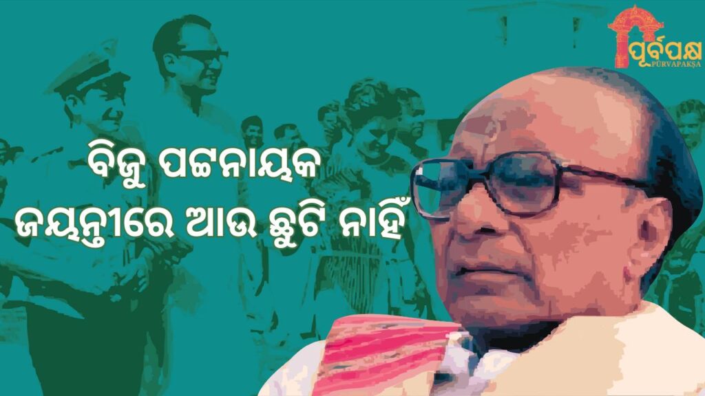 ସେହିପରି ମାର୍ଚ୍ଚ ୫ ତାରିଖ ହେଉଛି ଓଡ଼ିଶାର ମହାନ ବରପୁତ୍ର ବିଜୁ ପଟ୍ଟନାୟକଙ୍କ ଜୟନ୍ତୀ। ଏହାକୁ ରାଜ୍ୟ ସରକାର ମହାସମାରୋହରେ ପାଳନ କରିବା ପାଇଁ ନିଷ୍ପତ୍ତି ନେଇଛନ୍ତି। ତେବେ ଏହି ଦିବସକୁ ସରକାରୀ ଛୁଟି ଭାବେ ପାଳନ କରାଯିବ ନାହିଁ ବୋଲି ସ୍ପଷ୍ଟ କରାଯାଇଛି। ମାର୍ଚ୍ଚ ୫ ତାରିଖରେ ସରକାରୀ ଛୁଟି ହେବନି ବୋଲି ଆଜି ସାଧାରଣ ପ୍ରଶାସନ ଓ ସାଧାରଣ ଅଭିଯୋଗ ବିଭାଗ ପକ୍ଷରୁ ମଧ୍ୟ ବିଜ୍ଞପ୍ତି ପ୍ରକାଶ ପାଇଛି।