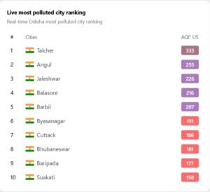 ଉପଲବ୍ଧ ତାଲିକା ଅନୁସାରେ କଟକର ଏୟାର କ୍ୱାଲିଟି ଇଣ୍ଡେକ୍ସ ୨୧୪, ଶିକ୍ଷା ହବ୍ ଜଟଣୀର ୨୨୫, ପର୍ଟ୍ୟଟନସ୍ଥଳୀ କୋଣାର୍କର ୨୧୨, ଶ୍ରୀକ୍ଷେତ୍ର ପୁରୀର ୨୨୪—ସବୁ ‘ସିଭିୟର’ ଶ୍ରେଣୀରେ। ତାଳଚେର ତ ଆଉ ଭୟଙ୍କର—ଏୟାର କ୍ୱାଲିଟି ଇଣ୍ଡେକ୍ସ ୨୩୭, ପିଏମ ୨.୫ ୧୬୨ ମିଲିଗ୍ରାମ/ଏମ³, ପିଏମ୧୦ ୨୧୯ ମିଲିଗ୍ରାମ/ଏମ³। ଏହି ସଂଖ୍ୟାଗୁଡ଼ିକ ବିଶ୍ୱସ୍ଥାସ୍ଥ୍ୟ ସଂଗଠନ ଓ ଜାତୀୟ ସୁରକ୍ଷା ସୀମାକୁ ଅନେକ ଗୁଣା ଅତିକ୍ରମ କରୁଛି। କୁଦାଲୋଇ ଓ ସମ୍ବଲପୁର ‘ଅନହେଲଦି’ ଶ୍ରେଣୀରେ ରହିଛି, ଯେଉଁଠାରେ ରାଉରକେଲା ମାତ୍ର ‘ମଡରେଟ’—କିନ୍ତୁ ଏହା କୌଣସି ସାନ୍ତ୍ୱନା ନୁହେଁ।