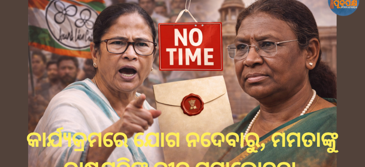 ପଶ୍ଚିମବଙ୍ଗରେ ଏକ ପ୍ରୋଟୋକଲ୍ ବିବାଦ ମଧ୍ୟରେ, ରାଷ୍ଟ୍ରପତି ଦ୍ରୌପଦୀ ମୁର୍ମୁଙ୍କ କାର୍ଯ୍ୟାଳୟ “ସମୟ ଅଭାବ” ଦର୍ଶାଇ ତୃଣମୂଳ କଂଗ୍ରେସ (ଟିଏମସି) ପ୍ରତିନିଧିମଣ୍ଡଳର ସାକ୍ଷାତ ପାଇଁ ଅନୁରୋଧକୁ ପ୍ରତ୍ୟାଖ୍ୟାନ କରିଛି। ଶୁକ୍ରବାର ସକାଳେ ସୂତ୍ରଗୁଡ଼ିକ ଏହି ସୂଚନା ପ୍ରଦାନ କରିଛନ୍ତି। ତଥାପି, ଏହାର ଜବାବରେ, ତୃଣମୂଳ କଂଗ୍ରେସ ଆସନ୍ତା ସପ୍ତାହରେ ସାକ୍ଷାତ ପାଇଁ ଏକ ନୂତନ ସମୟ ମାଗିଛି। ସୂତ୍ର ଅନୁଯାୟୀ, ଜଣେ ବରିଷ୍ଠ ତୃଣମୂଳ କଂଗ୍ରେସ ନେତା ସୋମବାର ରାଷ୍ଟ୍ରପତି ମୁର୍ମୁଙ୍କୁ ଚିଠି ଲେଖି ଆଦିବାସୀ ସମ୍ପ୍ରଦାୟ … Continue reading କାର୍ଯ୍ୟକ୍ରମରେ ଯୋଗ ନଦେବାରୁ, ମମତାଙ୍କୁ ରାଷ୍ଟ୍ରପତିଙ୍କ ତୀବ୍ର ସମାଲୋଚନା || President slams Mamata for not attending event