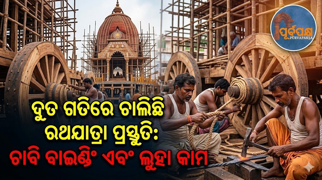 ପ୍ରତ୍ୟେକ ତୁମ୍ବାରେ ୧୬ ଯୋଡ଼ା ବନ୍ଧନ ଲଗାଯାଉଛି, ଯାହା ରଥ ଚକଗୁଡ଼ିକର ସମାବେଶରେ ଏକ ଗୁରୁତ୍ୱପୂର୍ଣ୍ଣ ପଦକ୍ଷେପ। ବର୍ତ୍ତମାନ ବାନ୍ଧ କାର୍ଯ୍ୟ ଚାଲୁ ଥିବାରୁ, କାରିଗରମାନେ ତୁମ୍ବାଗୁଡ଼ିକୁ ସୁରକ୍ଷିତ କରିବା ଆରମ୍ଭ କରିଛନ୍ତି, ଯାହା ଗଠନମୂଳକ ଢାଞ୍ଚାରେ ଗୁରୁତ୍ୱପୂର୍ଣ୍ଣ ଅଗ୍ରଗତିକୁ ଚିହ୍ନିତ କରୁଛି। ମଙ୍ଗଳବାର ସୁଦ୍ଧା ସମସ୍ତ ଚକର ନିର୍ମାଣ କାର୍ଯ୍ୟ ସମାପ୍ତ ହେବ ବୋଲି ଆଶା କରାଯାଉଛି।/odishatv/media/media_files/2026/04/27/rath-yatra-preparations-gather-pace-chariot-construction-advances-with-key-binding-and-iron-work-2026-04-27-12-02-13.png)