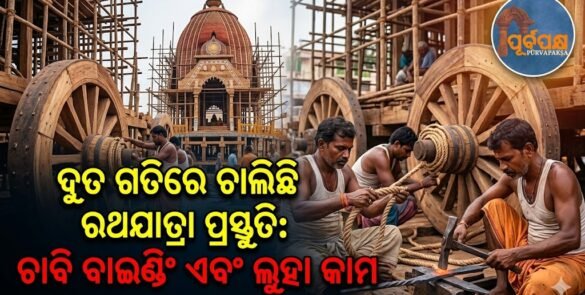 ମହାନ ରଥଯାତ୍ରା ପାଇଁ ପ୍ରସ୍ତୁତି ଧୀରେ ଧୀରେ ଆଗକୁ ବଢ଼ୁଛି, ସୋମବାର ସପ୍ତମ ଦିନରେ ତିନୋଟି ମହାନ ରଥର ନିର୍ମାଣ କାର୍ଯ୍ୟ ଦ୍ରୁତ ଗତିରେ ଚାଲିଛି। ରଥଖଳା (ରଥ ନିର୍ମାଣ ଅଗଣା) କାର୍ଯ୍ୟରେ ଚଳଚଞ୍ଚଳ, କାରିଗରମାନେ ଜଟିଳ କାର୍ଯ୍ୟ କରୁଥିବା ସମୟରେ କାତି ଏବଂ ହାତୁଡ଼ିର ତାଳପୂର୍ଣ୍ଣ ଶବ୍ଦରେ ପ୍ରତିଧ୍ୱନିତ ହେଉଛି। ରଥ ନିର୍ମାଣ ପ୍ରକ୍ରିୟା ଏକ ବ୍ୟବସ୍ଥିତ ଉପାୟରେ ଆଗକୁ ବଢ଼ୁଛି, କୁଶଳୀ କାରିଗରମାନେ ନିର୍ମାଣର ବିଭିନ୍ନ ପର୍ଯ୍ୟାୟରେ ନିୟୋଜିତ ଅଛନ୍ତି। ଚାଲୁଥିବା କାର୍ଯ୍ୟ ପ୍ରତୀକାତ୍ମକ … Continue reading ଦ୍ରୁତ ଗତିରେ ଚାଲିଛି ରଥଯାତ୍ରା ପ୍ରସ୍ତୁତି: ଚାବି ବାଇଣ୍ଡିଂ ଏବଂ ଲୁହା କାମ ସହ ରଥ ନିର୍ମାଣ ଆଗେଇଛି || Rath Yatra preparations underway at a rapid pace: Rath construction, including button binding and iron work, is underway