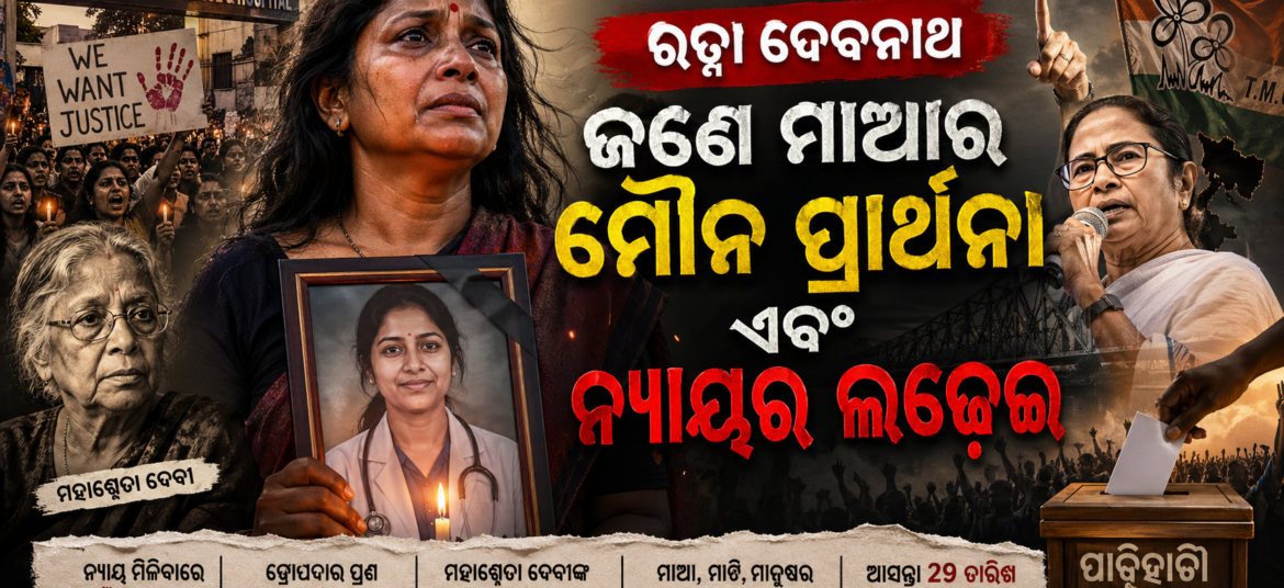ପଶ୍ଚିମବଙ୍ଗର ସାମ୍ପ୍ରତିକ ସାମାଜିକ-ରାଜନୈତିକ ପରିସ୍ଥିତିରେ ଜଣେ ମାଆଙ୍କ ଦୁଃଖ, ସଂଘର୍ଷ ଓ ନ୍ୟାୟ ପାଇଁ ଅଦମ୍ୟ ସଙ୍କଳ୍ପ ଆଜି ସମଗ୍ର ଦେଶର ମନୋଯୋଗ ଆକର୍ଷଣ କରୁଛି। ସେହି ନାମ ହେଉଛି ରତ୍ନା ଦେବନାଥ—ଜଣେ ମାଆ, ଯାହାଙ୍କ ଆଖିରୁ ଲୁହ ଶୁଖିନାହିଁ, ଓ ଯିଏ ନିଜ ଝିଅ ପାଇଁ ନ୍ୟାୟ ଆଣିବାକୁ ସମସ୍ତ ସୀମା ଉଲଙ୍ଘନ କରିବାକୁ ପ୍ରସ୍ତୁତ। ଦୁଃଖରୁ ସଙ୍କଳ୍ପ ପର୍ଯ୍ୟନ୍ତ ରତ୍ନା ଦେବନାଥଙ୍କ କାହାଣୀ କେବଳ ଜଣେ ବ୍ୟକ୍ତିଗତ ଦୁଃଖର କାହାଣୀ ନୁହେଁ, ଏହା ଏକ … Continue reading ରତ୍ନା ଦେବନାଥ: ଜଣେ ମାଆର ମୌନ ପ୍ରାର୍ଥନା ଓ ନ୍ୟାୟ ପାଇଁ ଲଢ଼େଇ || Ratna Debonath: A mother’s silent prayer and fight for justice