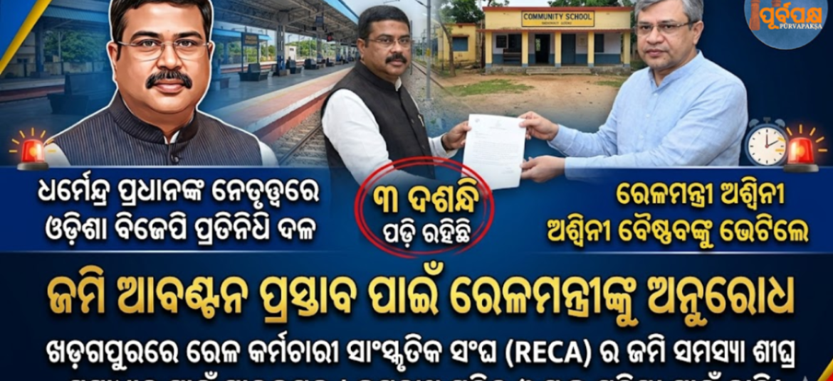 କେନ୍ଦ୍ର ଶିକ୍ଷା ମନ୍ତ୍ରୀ ଧର୍ମେନ୍ଦ୍ର ପ୍ରଧାନଙ୍କ ନେତୃତ୍ୱରେ ଓଡ଼ିଶାର ବିଜେପି ସାଂସଦମାନଙ୍କର ଏକ ପ୍ରତିନିଧି ଦଳ ମଙ୍ଗଳବାର ଦିନ ରେଳମନ୍ତ୍ରୀ ଅଶ୍ୱିନୀ ବୈଷ୍ଣବଙ୍କୁ ଭେଟି ଖଡ଼ଗପୁରରେ ରେଳ କର୍ମଚାରୀ ସାଂସ୍କୃତିକ ସଂଘ (RECA) ସହିତ ଜଡିତ ଦୀର୍ଘ ଦିନ ଧରି ପଡ଼ି ରହିଥିବା ଜମି ଆବଣ୍ଟନ ପ୍ରସଙ୍ଗର ଶୀଘ୍ର ସମାଧାନ ପାଇଁ ଅନୁରୋଧ କରିଥିଲେ। ପ୍ରତିନିଧି ଦଳ ଖଡ଼ଗପୁରର ନୂତନ ବସତି ଅଞ୍ଚଳରେ ଅବସ୍ଥିତ ପ୍ରାୟ ୫,୯୧୫ ବର୍ଗ ମିଟର ଜମିକୁ RECA ସପକ୍ଷରେ ନିୟମିତ କରିବା … Continue reading ଜମି ଆବଣ୍ଟନ ପ୍ରସ୍ତାବ ପାଇଁ ରେଳମନ୍ତ୍ରୀଙ୍କୁ ଅନୁରୋଧ || Request to Railway Minister for land allocation proposal