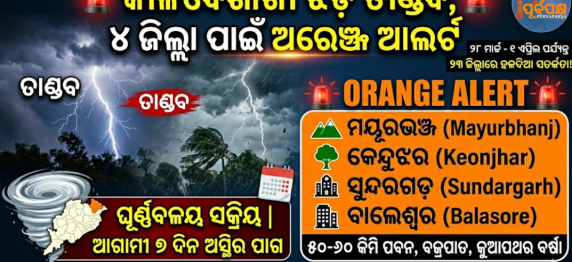 ଦିନରେ ପ୍ରବଳ ଗରମ ପଡୁଥିବା ବେଳେ, ସାରା ଓଡ଼ିଶାରେ ସନ୍ଧ୍ୟାରେ ହଠାତ୍ ଝଡ଼ପବନ ସହ ବର୍ଷା ହେଉଛି, ଗତ କିଛି ଦିନ ଧରି କାଳବୈଶାଖୀ ଝଡ଼ ଅନେକ ଜିଲ୍ଲାରେ ତାଣ୍ଡବ ରଚାଇଛି। ଭାରତୀୟ ପାଣିପାଗ ବିଭାଗ ଅନୁଯାୟୀ, ଓଡ଼ିଶା ଏବଂ ଏହାର ନିକଟବର୍ତ୍ତୀ ଅଞ୍ଚଳଗୁଡ଼ିକରେ ଏକ ଘୂର୍ଣ୍ଣିବଳୟ ସକ୍ରିୟ ରହିଛି, ଯାହା ଫଳରେ ରାଜ୍ୟ ସାରା ଅସ୍ଥିର ପାଗ ପରିସ୍ଥିତି ସୃଷ୍ଟି ହୋଇଛି। ଏହାର ପ୍ରଭାବରେ, ବିଭାଗ ଆଗାମୀ ସାତ ଦିନ ମଧ୍ୟରେ ବଜ୍ରପାତ ସହିତ ବଜ୍ରପାତ … Continue reading କାଳବୈଶାଖୀ ଝଡ଼ ତାଣ୍ଡବ; ୪ ଜିଲ୍ଲା ପାଇଁ ଅରେଞ୍ଜ ଆଲର୍ଟ || Storm Kalbaisakhi: Orange alert for 4 districts