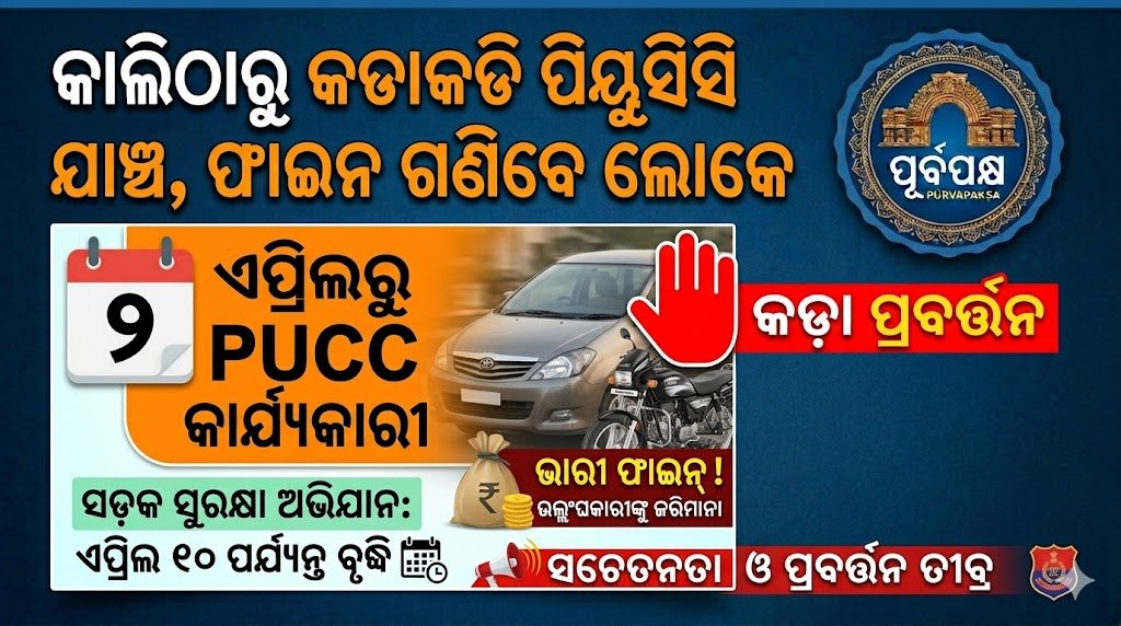 ୨ ଏପ୍ରିଲରୁ ପ୍ରଦୂଷଣ ନିୟନ୍ତ୍ରଣ ପ୍ରମାଣପତ୍ର (PUCC) କାର୍ଯ୍ୟକାରୀ କରିବା କଡ଼ାକଡ଼ି ହେବ, କର୍ତ୍ତୃପକ୍ଷ ସମଗ୍ର ଓଡ଼ିଶାରେ ଯାଞ୍ଚକୁ ତୀବ୍ର କରିବାକୁ ପ୍ରସ୍ତୁତ ଅଛନ୍ତି। ପ୍ରଦୂଷଣ ପ୍ରମାଣପତ୍ର ଯାଞ୍ଚ ୧ ଏପ୍ରିଲ ପର୍ଯ୍ୟନ୍ତ ଶିଥିଳ ରହିଥିଲେ ମଧ୍ୟ, ଅଧିକାରୀମାନେ ଏବେ ଅନୁପାଳନ ସୁନିଶ୍ଚିତ କରିବା ପାଇଁ କଡ଼ା ତଦାରଖ ଘୋଷଣା କରିଛନ୍ତି।
