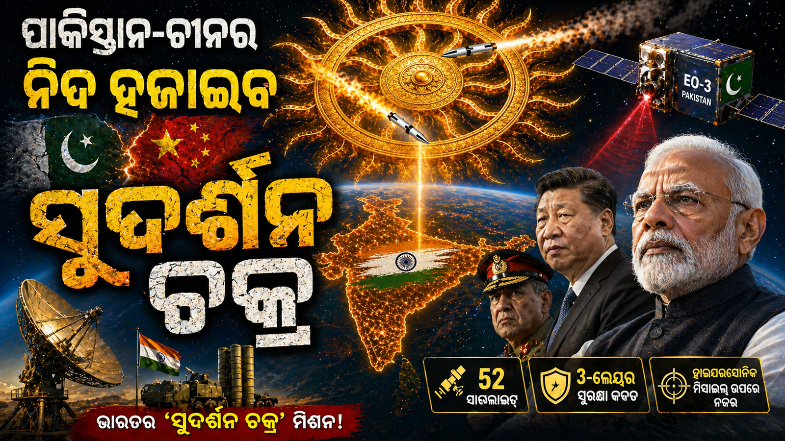 ଭାରତ ନିଜର ସୁରକ୍ଷା ପାଇଁ ୨୭,୦୦୦ କୋଟି ଟଙ୍କାର ଏକ ବିଶାଳ ପ୍ରକଳ୍ପ ଆରମ୍ଭ କରିଛି, ଯାହାର ନାମ ହେଉଛି ‘ସୁଦର୍ଶନ ଚକ୍ର’। ଏହା ଅଧୀନରେ ଆଗାମୀ ୧୦ ବର୍ଷ ମଧ୍ୟରେ ୫୨ଟି ସାଟେଲାଇଟ୍ ମହାକାଶକୁ ପଠାଯିବ। ସେଥିମଧ୍ୟରୁ ୨୧ଟି ଇସ୍ରୋ (ISRO) ଏବଂ ୩୧ଟି ଘରୋଇ କମ୍ପାନୀ ଦ୍ୱାରା ପଠାଯିବ। ୨୦୨୬ର ତୃତୀୟ କ୍ୱାର୍ଟରରେ ଏହାର ପ୍ରଥମ ପର୍ଯ୍ୟାୟ ଲଞ୍ଚ ହେବାକୁ ଯାଉଛି।