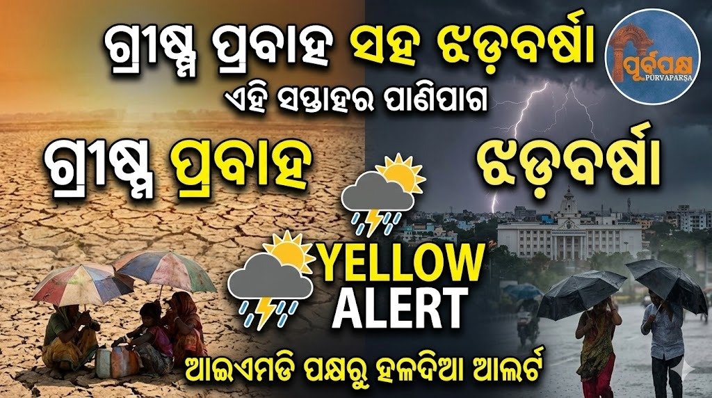 ପାଣିପାଗ ବିଭାଗ ପକ୍ଷରୁ ଜାରି କରାଯାଇଥିବା ସର୍ବଶେଷ ପୂର୍ବାନୁମାନ ଅନୁଯାୟୀ, ଆସନ୍ତା ସପ୍ତାହରେ ଓଡ଼ିଶାରେ ଝଡ଼ବର୍ଷା, ପ୍ରବଳ ପବନ ଏବଂ ଲଗାତାର ଗରମ ପ୍ରବାହର ମିଶ୍ରଣ ଦେଖିବାକୁ ମିଳିବ। ଭାରତୀୟ ପାଣିପାଗ ବିଭାଗ (IMD) ବିଭିନ୍ନ ଜିଲ୍ଲା ପାଇଁ ହଳଦିଆ ସତର୍କତା (ସତର୍କ ରୁହନ୍ତୁ) ଜାରି କରିଛି, ବଜ୍ରପାତ, ପ୍ରବଳ ପବନ ଏବଂ ତାପମାତ୍ରା ବୃଦ୍ଧି ସମ୍ପର୍କରେ ବାସିନ୍ଦାଙ୍କୁ ସତର୍କ କରାଇଛି।