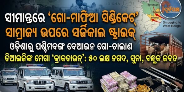 ଓଡ଼ିଶାରୁ ପଶ୍ଚିମବଙ୍ଗକୁ ଚାଲୁଥିବା ବେଆଇନ ଗୋ-ଚାଲାଣର ମେରୁଦଣ୍ଡ ଭାଙ୍ଗିବା ପାଇଁ ପୂର୍ବାଞ୍ଚଳ ପୋଲିସ ଏକ ବଡ଼ ଧରଣର ଅପରେସନ୍ ଆରମ୍ଭ କରିଛି। ଦୀର୍ଘ ଦିନର ଯୋଜନା ଏବଂ ଗୁଇନ୍ଦା ସୂଚନାକୁ ଆଧାର କରି ମଙ୍ଗଳବାର ବାଲେଶ୍ୱର, ଭଦ୍ରକ ଏବଂ ମୟୂରଭଞ୍ଜ ଜିଲ୍ଲାରେ ଏକକାଳୀନ ଚଢ଼ାଉ କରାଯାଇଛି। ଏହି ମେଗା କ୍ରାକଡାଉନ୍ରେ ଗୋ-ମାଫିଆଙ୍କ କଳା ସାମ୍ରାଜ୍ୟର ଚିତ୍ର ପଦାକୁ ଆସିଛି। ଚଢ଼ାଉ ବେଳେ ପୋଲିସ କେବଳ ମାଫିଆଙ୍କୁ ଅଟକ ରଖିନାହିଁ, ବରଂ ୫୦ ଲକ୍ଷରୁ ଅଧିକ ନଗଦ ଟଙ୍କା, … Continue reading ସୀମାନ୍ତରେ ‘ଗୋ-ମାଫିଆ ସିଣ୍ଡିକେଟ୍’ ସାମ୍ରାଜ୍ୟ ଉପରେ ସର୍ଜିକାଲ ଷ୍ଟ୍ରାଇକ୍ || Surgical strike on ‘Go-Mafia Syndicate’ empire on the border