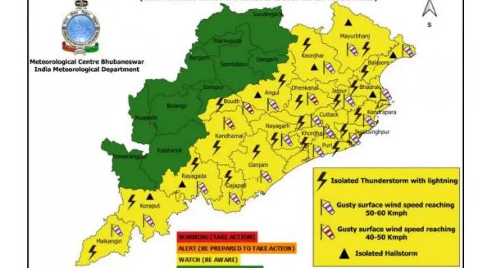 ଏପ୍ରିଲ ୫, ୨୦୨୫ ପର୍ଯ୍ୟନ୍ତ କେତେକ ଜିଲ୍ଲାରେ ବଜ୍ରପାତ ସହ ଘଣ୍ଟା ପ୍ରତି ୫୦ରୁ ୬୦ କିଲୋମିଟର ବେଗରେ ପବନ ବହିବା ନେଇ ୟେଲୋ ଓ୍ଵାର୍ଣ୍ଣିଂ ଜାରି କରିଛି ଆଇଏମଡି ।