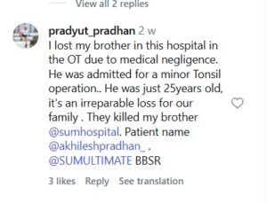 ଚିକିତ୍ସା ଅବହେଳା ଯୋଗୁଁ ମୁଁ ଏହି ହସ୍ପିଟାଲରେ ଓଟିରେ ମୋ ଭାଇକୁ ହରାଇଲି। ତାଙ୍କୁ ଏକ ଛୋଟ ଟନସିଲ୍ ଅସ୍ତ୍ରୋପଚାର ପାଇଁ ଭର୍ତ୍ତି କରାଯାଇଥିଲା। ସେ ମାତ୍ର ୨୫ ବର୍ଷ ବୟସର ଥିଲେ, ଏହା ଆମ ପରିବାର ପାଇଁ ଏକ ଅପୂରଣୀୟ କ୍ଷତି। ସେମାନେ ମୋ ଭାଇକୁ ହତ୍ୟା କଲେ।