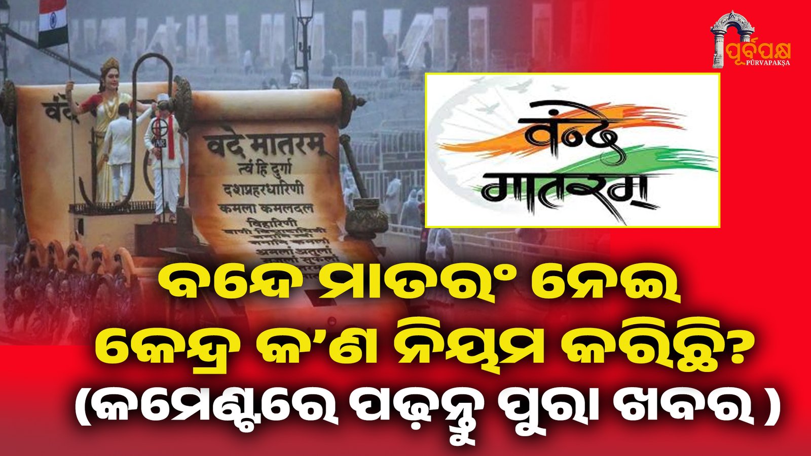 ସ୍ୱରାଷ୍ଟ୍ର ମନ୍ତ୍ରଣାଳୟ ଜାତୀୟ ଗୀତ ‘ବନ୍ଦେ ମାତରମ୍’ ସମ୍ପର୍କରେ ନୂତନ ନିର୍ଦ୍ଦେଶାବଳୀ ଜାରି କରିଛି। ନୂତନ ନିୟମ ଅନୁଯାୟୀ, ଯେକୌଣସି ସରକାରୀ କାର୍ଯ୍ୟକ୍ରମ, ସରକାରୀ ସ୍କୁଲ କାର୍ଯ୍ୟକ୍ରମରେ କିମ୍ବା ଅନ୍ୟାନ୍ୟ ଆନୁଷ୍ଠାନିକ ସମାବେଶରେ ‘ବନ୍ଦେ ମାତରମ୍’ ବାଜିବା ସମୟରେ ସମସ୍ତ ଲୋକଙ୍କୁ ସମ୍ମାନ ଜଣାଇ ଠିଆ ହେବାକୁ ପଡ଼ିବ । ଏହି ଗୀତଟି ଏବେ ଜାତୀୟ ସଙ୍ଗୀତ ‘ଜନ ଗଣ ମନ’ ପରେ ତୁରନ୍ତ ବଜାଯିବ, ଯାହାଦ୍ୱାରା ସମ୍ମାନ ଏବଂ ଜାତୀୟ ଭାବନାର ସ୍ପଷ୍ଟ ବାର୍ତ୍ତା ଦିଆଯାଇପାରିବ ।